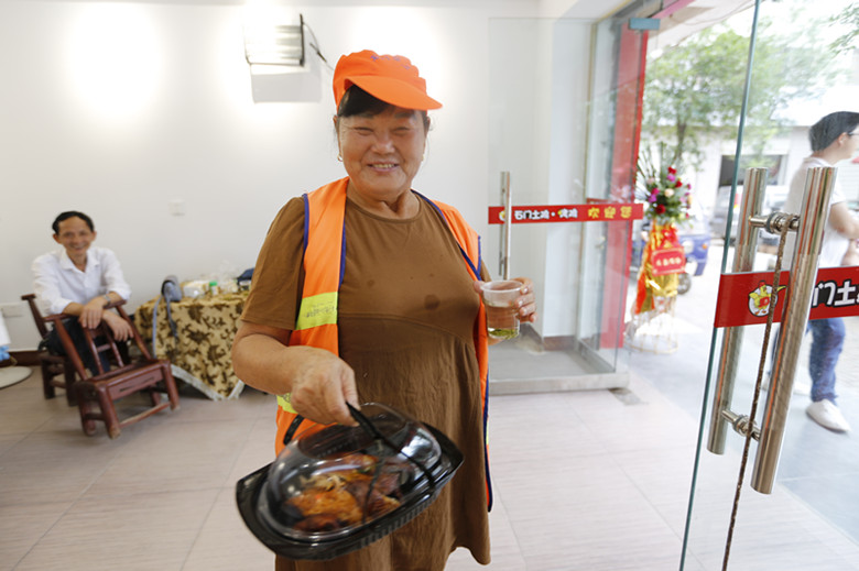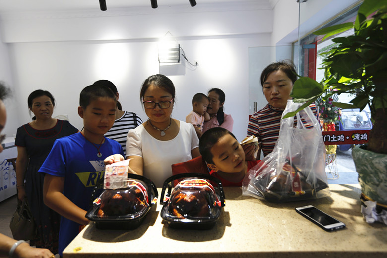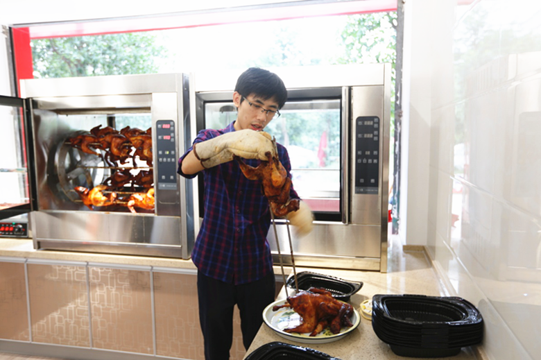 老板娘的兒子親自上陣,他說(shuō):“第一爐烤雞出爐讓我來(lái)顯顯身手。”雖然動(dòng)作有點(diǎn)生疏,但是相信不久之后,會(huì)愈加熟練。